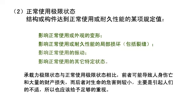 承載力極限狀態(tài)與正常使用極限狀態(tài)相比;前者可以導致人身傷亡和大量的財產損失,而后者對生命的危害則較小,主要是引起人們的不適,所以也應該給予足夠的重視;