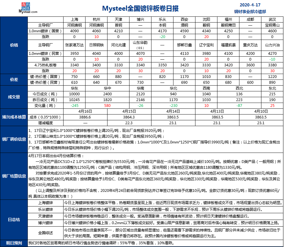 2020年4月17日鍍鋅板卷指數(shù)為85.69與昨日持平。價(jià)格方面,截至發(fā)稿,1.0mm鍍鋅板卷平均價(jià)格為4285元/噸,較上一個(gè)交易日上漲4元/噸。市場(chǎng)方面,博興、沈陽(yáng)等地區(qū)鍍鋅板卷價(jià)格小幅反彈,在唐山限產(chǎn)事件的發(fā)酵下,部分城市經(jīng)銷商情緒面出現(xiàn)一定的改觀,存在看漲情緒。多數(shù)城市經(jīng)銷商考慮到當(dāng)前市場(chǎng)庫(kù)存仍處于同期高位,則是選擇靜觀其變,等待具體減產(chǎn)文件出臺(tái)。
