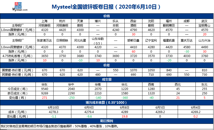 我的鋼鐵網(wǎng)訊:10日鍍鋅板卷指數(shù)為88.46,與上一個(gè)交易日持平。截至發(fā)稿,1.0mm鍍鋅板卷平均價(jià)格為4500元/噸,較上一個(gè)交易日上漲1元/噸。市場(chǎng)方面,鋼廠紛紛上調(diào)7月份期貨價(jià)格政策250元/噸以上,貿(mào)易商訂貨成本較高,挺價(jià)意愿較強(qiáng)。