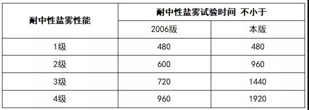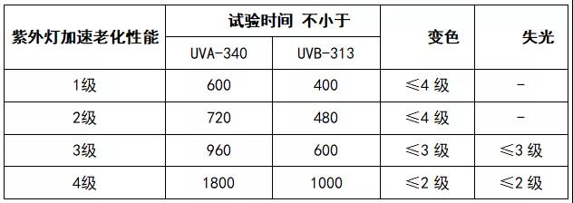 ▼ 綜合考慮彩涂板的使用環(huán)境、使用壽命和彩涂板的實(shí)物水平,彩涂板的耐中性鹽霧性能、紫外燈加速老化性能分為四個等級
