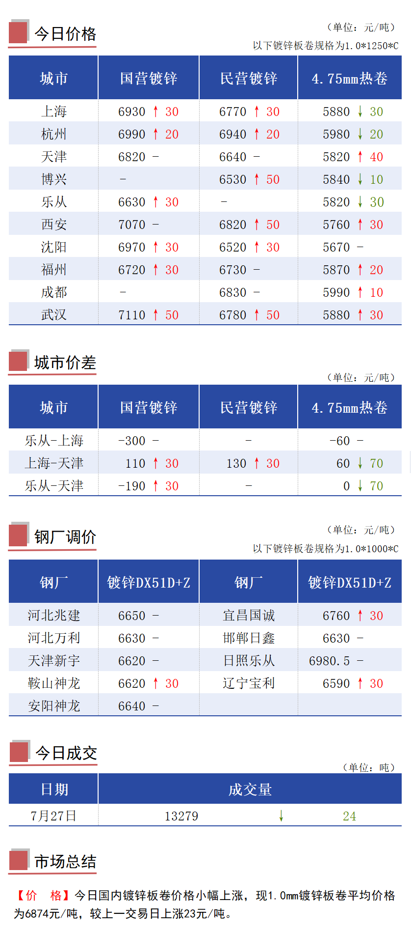 2021-7-27日鍍鋅板卷指數(shù)為137.59,較上一交易日增長(zhǎng)0.38%?,F(xiàn)1.0mm鍍鋅板卷平均價(jià)格為6874元/噸,較上一交易日上漲23元/噸。