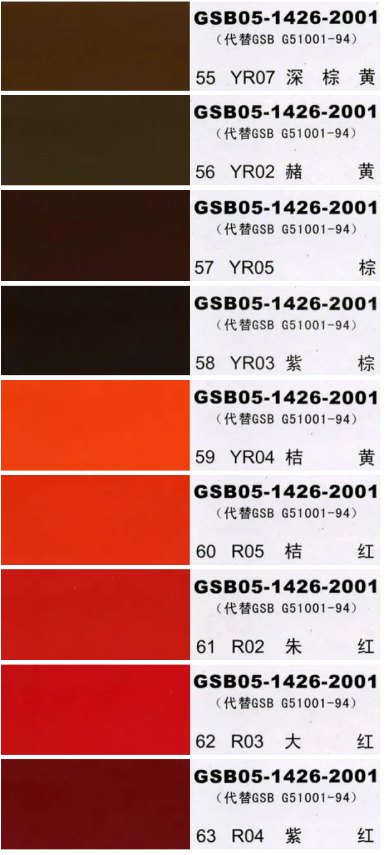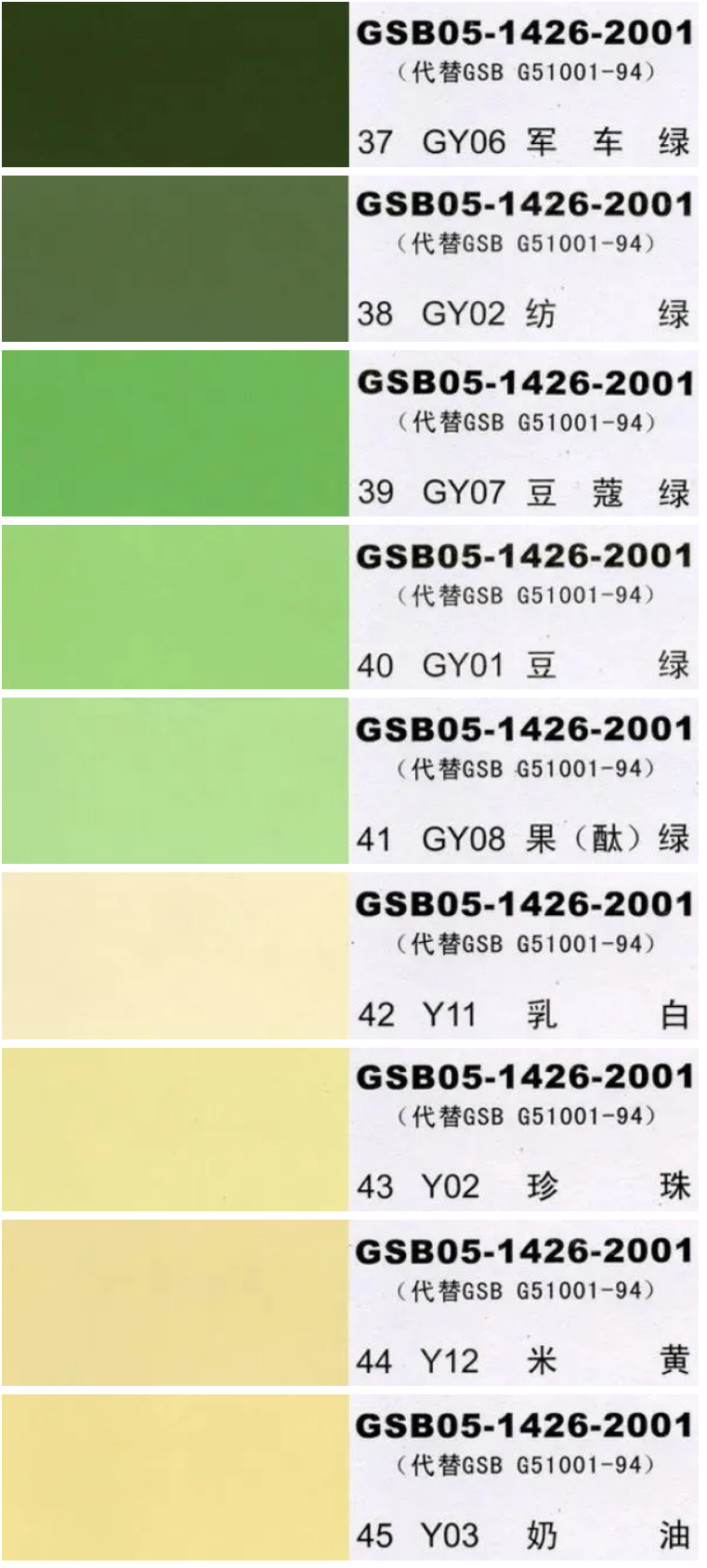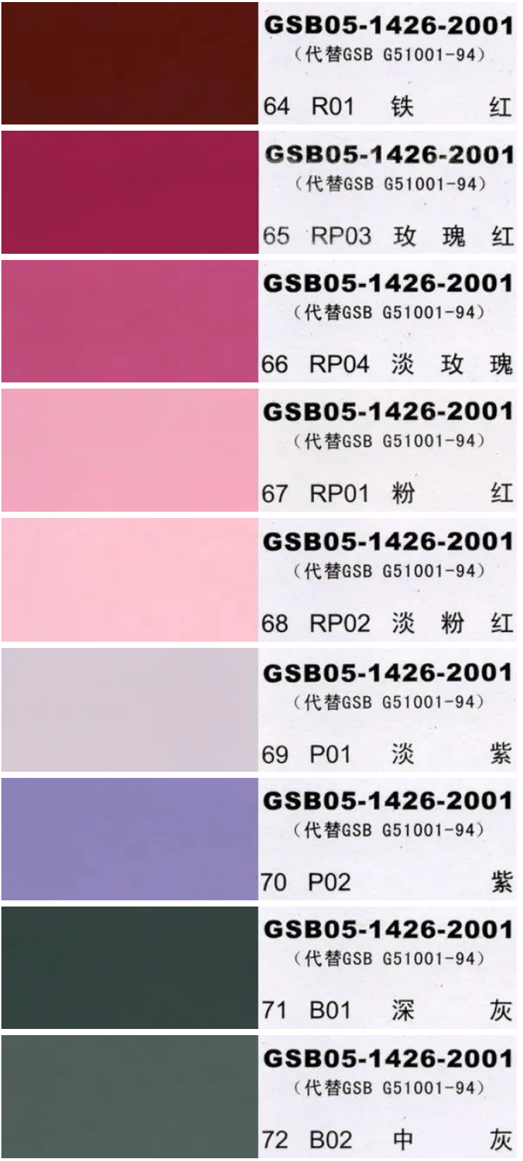 【1】國(guó)標(biāo)色卡-漆膜顏色標(biāo)準(zhǔn)樣卡簡(jiǎn)介(GSB05-1426-2001);全國(guó)涂料和顏料標(biāo)準(zhǔn)化技術(shù)委員會(huì)修訂,含83種顏色,光面效果。每個(gè)顏色都有國(guó)家統(tǒng)一標(biāo)準(zhǔn)的編號(hào),適用于油性涂料方面使用。